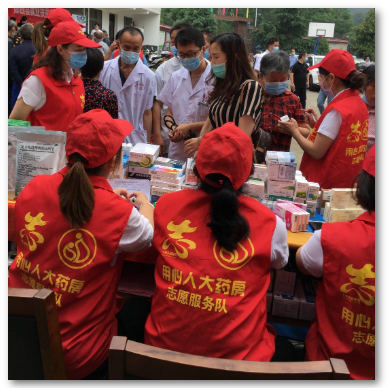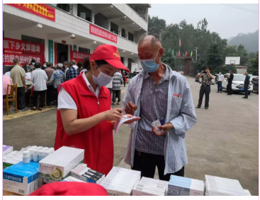 用心人鄖西志愿服務(wù)隊的10名隊員早早的來到現(xiàn)場,把藥品分類陳列,根據(jù)現(xiàn)場縣醫(yī)療隊開具的處方,用執(zhí)業(yè)藥師專業(yè)的服務(wù)水準一一為村民發(fā)放藥品,并教村民如何申請慢性病定點補助,減輕他們的就醫(yī)用藥負擔。她們憑著專業(yè)的解說、耐心的解答、用心的囑咐讓村民頻頻點頭,連連感謝,雖然隔著口罩,看不到他們泛起微笑的臉,但每一個透出信賴的、溫暖的目光也久久溫暖著我們,溫暖著陰雨天氣。